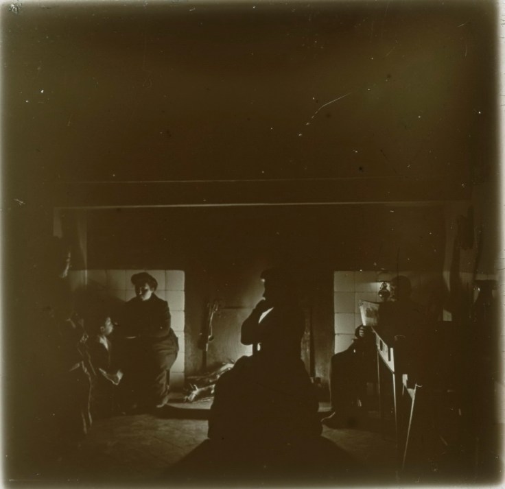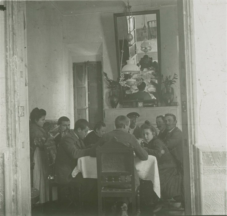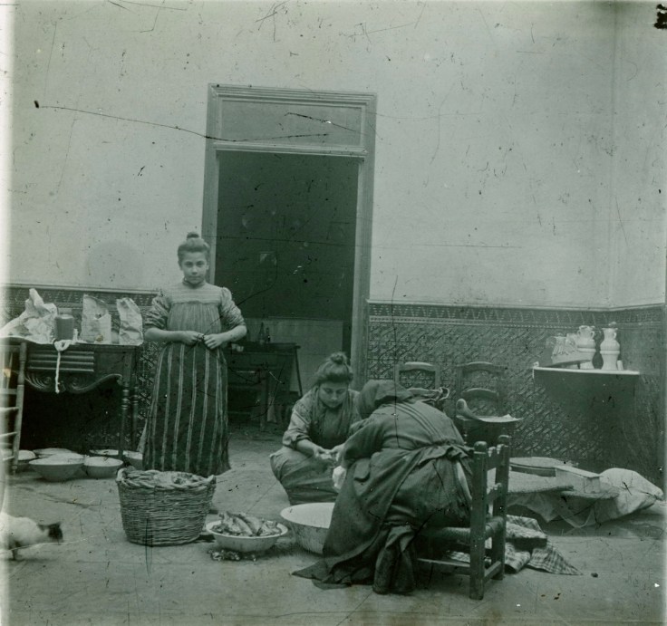 Lavadas las tripas en las aguas del Nacimiento o de la Fuentezuela llegaba el momento del embutido. Morcillas colgadas en la cocina en una foto de impactante efecto 3D al visionar la estereoscopia. El chorizo recién embutido se colocaba ordenadamente sobre la mesa donde se pinchaba antes de meterlo en el tabaque para llevarlo a colgar. Salchichón, butifarra y otras delicias salieron de esta cocina gracias al buen hacer de aquellas mujeres… un eslabón de la cadena, posiblemente el primero en dejar testimonio gráfico, de este ancestral ritual de la matanza que aprendieron de sus mayores y que tan bien supieron transmitirnos a las generaciones posteriores…
