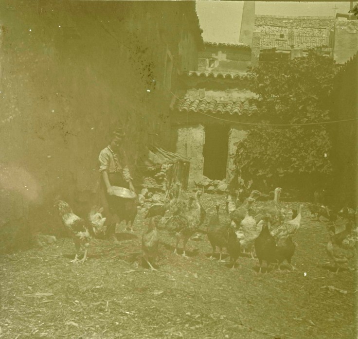 El servicio doméstico contaba con dos jóvenes que, más que ser apreciadas formaban parte de la familia. Eran Carmen y Ana María, la primera de “Cabrilla” y la segunda de “la Moralea”. Ya hemos tenido ocasión de verlas posar “disputándose” el taxiphote, también llamado estereoscopio, en el patio de cristales y ahora las observamos inmersas en la faena cotidiana. En esa enorme pila de lavar de piedra, de una sola pieza que encontramos a la entrada del corral.