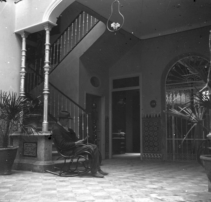 Este patio de cristales posiblemente sea el espacio más fotografiado de la casa, donde destaca ese arco de entrada que daba acceso desde el desembarco de la escalera y que tanto se asemeja al califal cordobés, tan utilizado en la arquitectura regionalista andaluza. Cerdá posa bajo ese arco con una bandeja de revelado en sus manos.