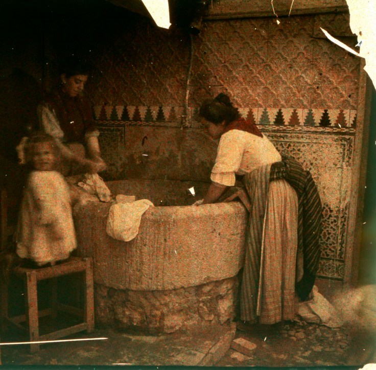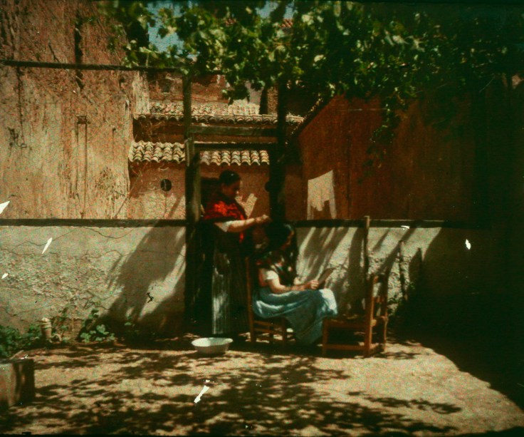 Si las dos imágenes son bellas, la autocroma destaca por incluir a una niña en la composición. Una escena que nos traslada al tiempo en el que las niñas aprendían jugando las labores que entonces se asignaban a su género…