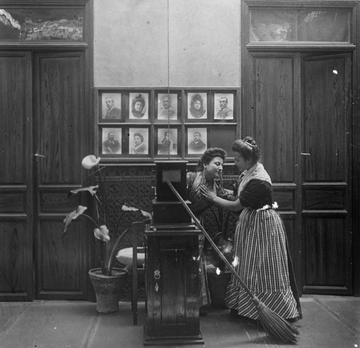 Las jóvenes dedicadas al servicio doméstico también aparecen frecuentemente fotografiadas, como en estas simpáticas composiciones en las que se disputan el estereoscopio, que es un mueble de madera con visores ópticos para visionar cristales fotográficos –estereoscopias– que al tener dos imágenes que simulan la visión ocular por estar tomadas desde dos puntos de vista poco separados entre sí, puestas una al lado de otra y miradas cada una con un ojo, da la sensación de relieve.