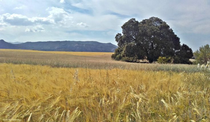Situada en el cortijo de la Viña, antiguamente llamado de San Juan, ocupa un espacio cercano al camino, en una amplia parcela de 32 hectáreas dedicadas a cereal donde, durante el siglo XIX hubo una viña, de ahí el nombre actual de la finca. Ya le hemos dedicado un post donde más o menos damos cuenta de sus características y de todo podemos concluir que se trata de uno de los escasos testimonios que quedan de la vegetación que hasta no hace tanto predominaba en estos parajes. Una transformación del paisaje que milagrosamente no ha terminado con este hermoso ejemplar de encina, tal y como Pedro me comentó durante una enriquecedora conversación en la que me contó que no hace tanto que esta parcela contaba con muchas más chaparras grandes, matas de encina y retamas, de ahí que familiarmente fuera conocida como «El Matorral».