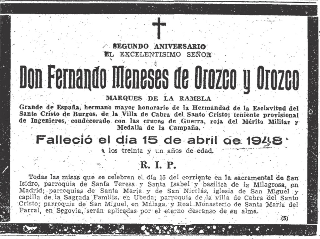 Precisamente fue el último marqués efectivo de Cabra, Martín de Orozco y Argote de Molina quien alcanzó para la estirpe la consideración de Grandes de España gracias a su papel en la defensa de Úbeda durante la Guerra de la Independencia, de tal modo que Fernando VII otorgó este reconocimiento «para sí y sus sucesores» el 16 de octubre de 1816. Así, desde su hermoso palacio de Úbeda seguirían administrando sus propiedades y dedicándose a otras empresas como la emprendida por Amalia de Orozco y Loring, quien fundó en Úbeda el segundo de los paradores nacionales gracias a su hábil gestión durante la visita que el rey Alfonso XIII hizo a Úbeda en 1926, cuando se hospedó en el palacio de los marqueses de La Rambla, lo que es una clara muestra del estatus y consideración de la que gozaban. Pero la relación con Cabra nunca desapareció, sobre todo en lo referido a la devoción al Cristo de Burgos, así, en 1929 la marquesa dona 100 pesetas como contribución a la adquisición del nuevo trono de plata Meneses del Cristo de Burgos y en 1948 la hermandad de la Esclavitud nombra hermano mayor honorario a don Fernando Meneses de Orozco y Orozco, XI Marqués de La Rambla de Cabra del Santo Cristo «otorgado para sí y sus sucesores en Junta General Extraordinaria celebrada el día 6 de marzo de 1948 en Cabra del Santo Cristo«.