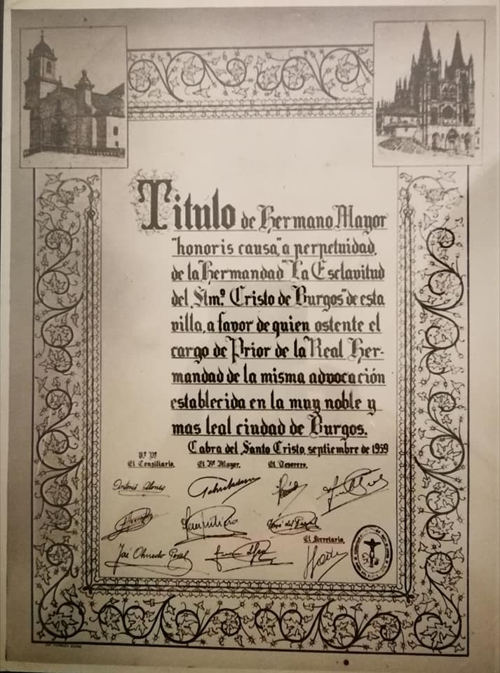Después de más de trescientos años compartiendo devoción hubo que esperar a que mediado el pasado siglo se establecieran lazos entre Burgos y Cabra, los dos focos por excelencia, de manera que tuvo que ser un burgalés afincado en Cabra quien diera el primer paso, se trata del párroco Antonio Alonso Hinojal. De tal forma que en mayo de 1959 Gabriel Adarve, el entonces hermano mayor de la cofradía de la Esclavitud publicó un artículo en el Diario de Burgos, lo que tuvo un eco inmediato cuando el prior de la hermandad cabrileña fue nombrado “Prior honorario de la Real Hermandad de Burgos”, a lo que respondió la corporación cabrileña nombrando al prior de la hermandad burgalesa “Hermano mayor honoris causa a perpetuidad”. Después comenzarían una serie de intercambios y visitas institucionales que motivaron el hermanamiento entre ambas localidades, estrechando unos lazos que afortunadamente hoy gozan de una extraordinaria salud como es manifiesto con la continua interrelación humana y cultural de los últimos años, uno de cuyos últimos episodios significó la reciente visita institucional que giró a nuestra localidad el Alcalde de esta hermosa capital castellana, hoy tan cercana para los cabrileños.