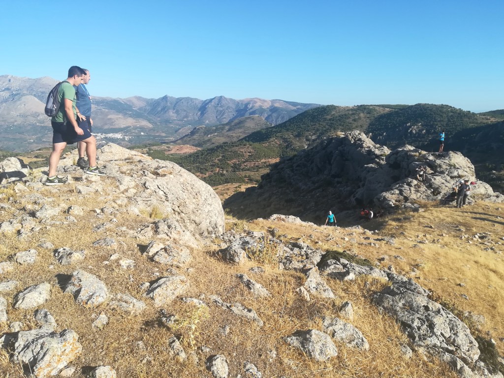 A poco que estemos atentos descubriremos cerámica esparcida por toda esta cima, por lo que cabe suponer que esta formara parte de las atalayas que coronaron estos montes durante los tiempos en los que estas tierras eran frontera entre castellanos y nazaríes. Si Solera es un topónimo de origen árabe que hace referencia a su situación geográfica (Sur, en contraposición a Polera, que sería Norte), estamos al Sur del Sur, pues nuestra situación es más meridional que el castillo que divisamos, que no es otro que el de esta bella localidad vecina. Después de tal espectáculo hacemos la foto de grupo en la cumbre antes de volver sobre nuestros pasos hasta la valla que saltamos, pues la vuelta la haremos por otro lugar, así que seguiremos conociendo esta Sierra Cruzada, tan cercana y tan desconocida. Un espacio que fue el primer escenario de las andanzas del prestigioso botánico Josep Cuatrecases i Arumi cuando herborizó Sierra Mágina durante la década de los veinte del pasado siglo.