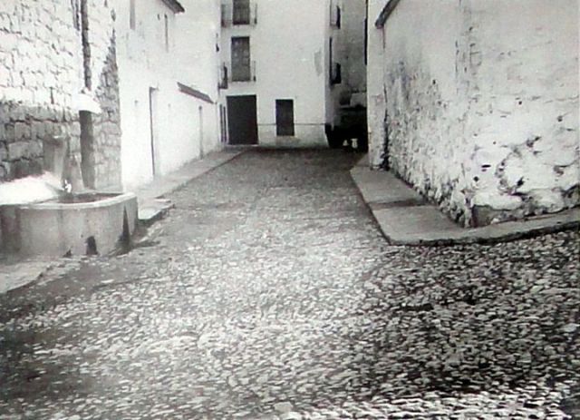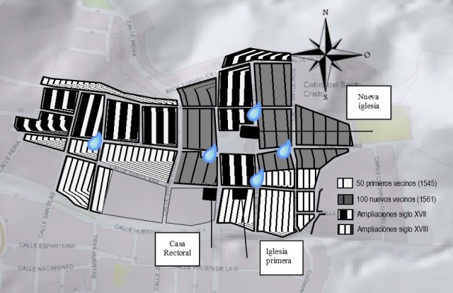 Cabe suponer que la primera fuente se instalara en este espacio principal donde se estableció el poder religioso y seguramente también el civil, para lo que sería necesaria la captación y conducción hasta aquí de las aguas del Nacimiento. Una obra de ingeniería que consistiría en una acequia que aprovechando el desnivel transportara el agua por gravedad. Un canal que iría en ligera pendiente hasta la actual calle Santa Ana, más o menos en su confluencia con la actual calle San Blas, desde donde bajaría hasta el lugar mencionado. Pero pronto se toma la decisión de enviar nuevos colonos, de manera que en 1561 comienzan a establecerse otros cien vecinos más, por lo que se haría necesario ampliar el casco urbano y redimensionar las infraestructuras, de tal forma que el casco urbano se extiende hacia el Norte conformando las actuales calles de Antolinos, Ríos, Soto y sus transversales Parras y Cobos. Imaginemos esta superficie salpicada de edificios en construcción que seguramente tardaron décadas en consolidar urbanísticamente la zona, así que inicialmente quedaría un gran espacio libre que iría desde la calle Santa Ana hasta el barranco del Prior. Una amplia superficie en cuyo centro se terminaría ubicando la nueva iglesia que comienza a construirse en 1587.