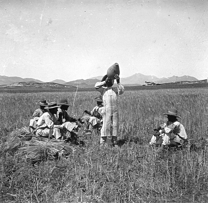 Cuando llegan al Haza de la Laguna, una cuadrilla de segadores sentados sobre haces de paja se dispone a almorzar. Aún quedan horas para que el sol se ponga y vuelvan al pueblo haciendo sonar sus caracolas, así que es el momento de reponer fuerzas. Un zagal acaba de traer un cántaro de agua fresca y les acerca los hatos con las viandas, mientras que nuestros viajeros también aprovecharán para tomar un bocado. Cuando terminan, cual director de cine, Cerdá solicita la colaboración de los componentes de la cuadrilla para que formen una composición que tiene en mente. La estación de Larva y el perfil de Mágina en el horizonte enmarcan esta escena que no sólo muestra el paisaje, sino que dignifica el trabajo en el campo de estos segadores en la línea temática explorada por ciertos pintores del XIX, como Millet.