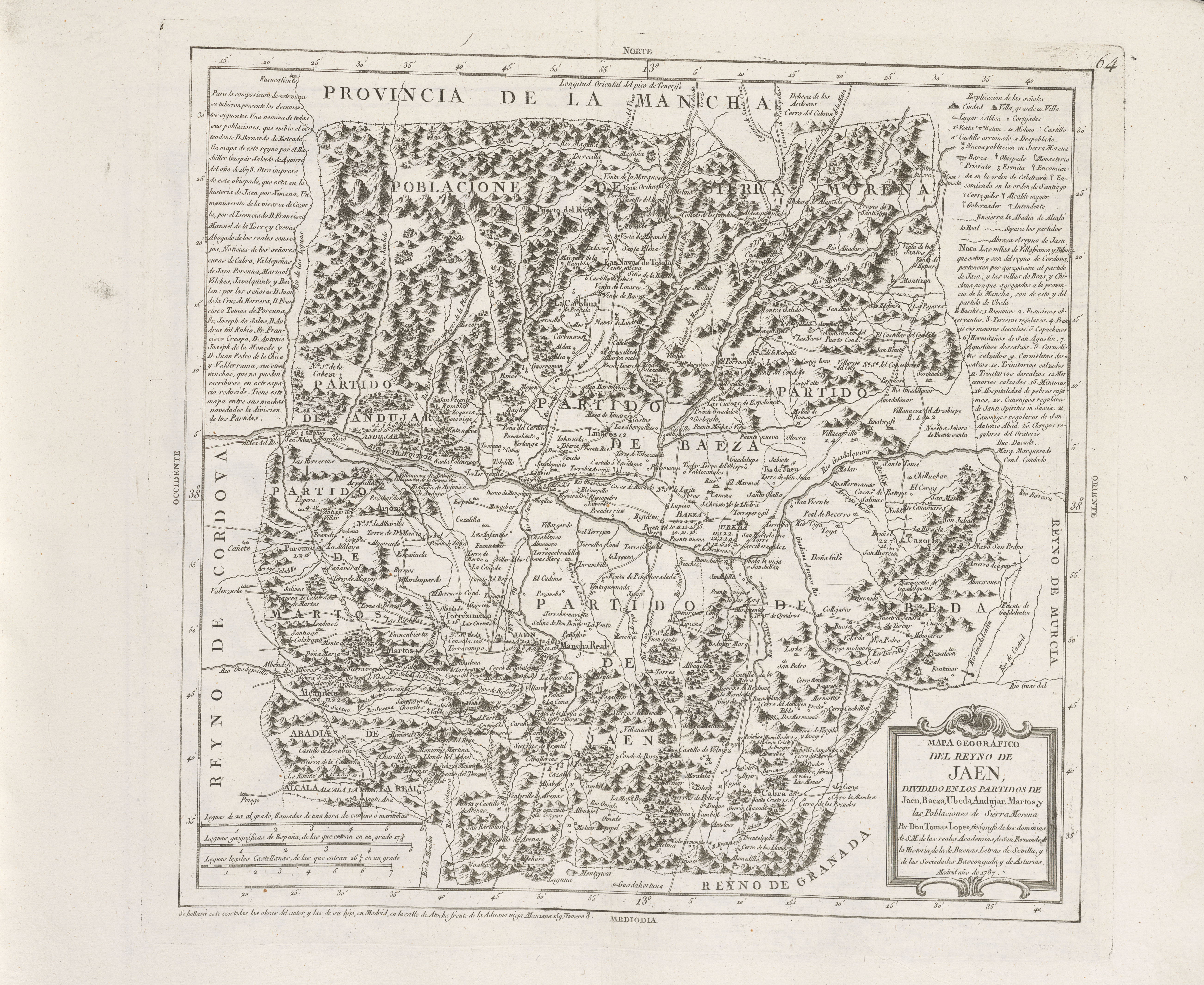 Al salir de Úbeda desciende la carretera suavemente de la Loma al Guadalquivir por terreno cultivado; a los 13 kilómetros pasa el río por el puente viejo de dos arcos, y después de un corto ascenso entra en terreno llano, encontrando varios cortijos, las ventas Nueva y Vieja, y llegando a los 58 kilómetros (desde e. Vilchez) a Jódar, villa, cabeza de ayuntamiento, con 4.748 habitantes y 1.229 viviendas, situada en un llano, y con un castillo arruinado. Sus habitantes tienen por industria principal la elaboración del esparto.