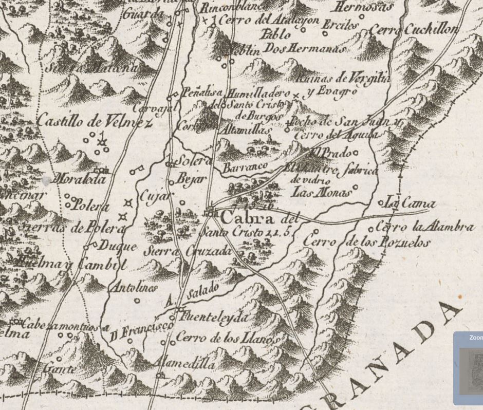 Es a partir de este momento cuando Cabrilla aparece en todas las guías. Tomás López de Vargas Machuca creará en 1787 varios planos que vienen a confirmar que en aquellos años eran varios los caminos que coincidían en nuestra localidad, lo que al margen de la importancia de estos, convertía a Cabra en un verdadero cruce de caminos. De este geógrafo precisamente he tomado el detalle de la zona sureste de la provincia correspondiente a su Atlas Geográfico de España, donde podemos apreciar cómo la variante del camino a través de Solera también está representada -pasaba por Cújar y Béjar-. Aquí se dibuja fielmente el trazado del camino que desde Úbeda se dirigía a Guadix y se constata además la existencia de otros caminos que desde Cabra se dirigían a Granada, Zújar y Quesada.