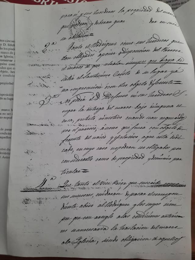 - No podrá el don Ildefonso ni sus herederos negar la entrega del marco bajo ninguna excusa, pretesto, ni motivo cuando sean requeridos por el Párroco, a no ser que fuera con objeto diferente del único y exclusivo al que está dedicado, en cuyo caso no podrán ser obligados por considerarlo como de propiedad y dominio particular.