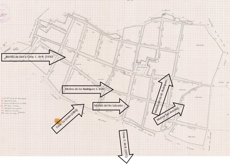 También sabemos que el Tío Miguel Rodríguez tuvo un molino en la esquina que conforman las calles Antolino y Parras, a cuya fachada estaba anexa la popular fuente del Chorrillo. Pero el primer documento gráfico es de Cerdá y Rico, quien fotografió las faenas en un molino que había en la calle de La Palma, muy cerca de su casa, justo donde hoy está el número 19. Era el molino del tío Salvador…