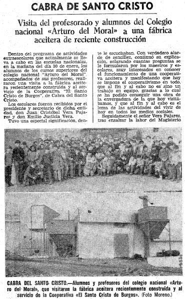 Y es que, las vetustas instalaciones y la ubicación de la cooperativa Cristo de Burgos recomendaban su traslado, por lo que se inició la construcción de una nueva fábrica cuando finalizaba la década de los sesenta. En 1970 se concedió un préstamo por valor de 7.360.000 pesetas[5] para hacer frente a las obras que se venían ejecutando y que finalizaron en esa misma campaña. Así que en febrero de 1971 visitaron las instalaciones un grupo de alumnos del colegio Arturo del Moral[6].