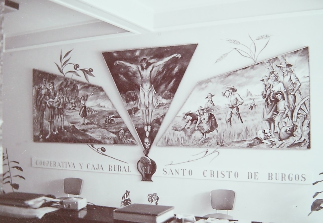 Según noticia publicada en el diario Ideal en febrero de 1950[3], el que era vicesecretario provincial de obras sindicales visitó nuestro pueblo para cambiar impresiones con “los mandos de aquella hermandad, así como con los numerosos afiliados a la misma con el fin de constituir una cooperativa”… y finaliza la nota diciendo que “es un hecho la constitución de la Cooperativa Aceitera Cristo de Burgos”. De ello se deduce que había un germen previo a la cooperativa, la Hermandad de Labradores y Ganaderos, que tendría su origen al comienzo del régimen franquista. El retablo cerámico del Cristo de Burgos del que ya hablamos en otra de nuestras entradas coronaba la puerta de entrada, originalmente flanqueado por los símbolos franquistas de la época.