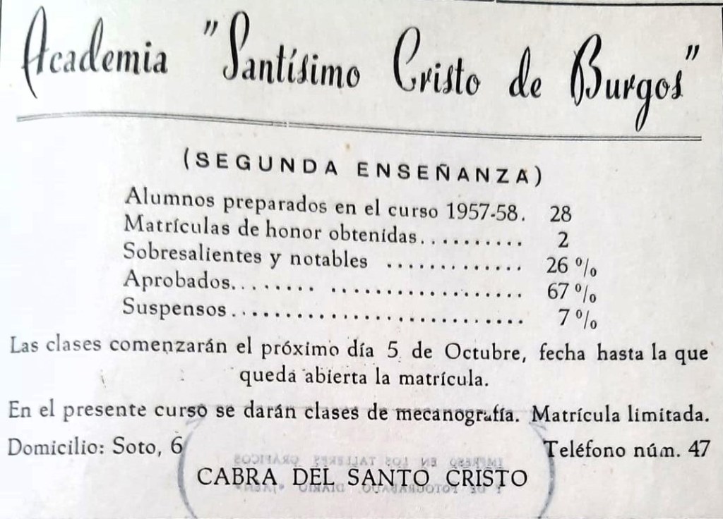 En el programa de fiestas de 1958 hay un anuncio por el que conocemos el número de alumnos que entonces se presentaron y el porcentaje según notas, lo que pone de manifiesto el nivel de aquellos bachilleres cabrileños salidos de la Academia “Stmo. Cristo de Burgos”.