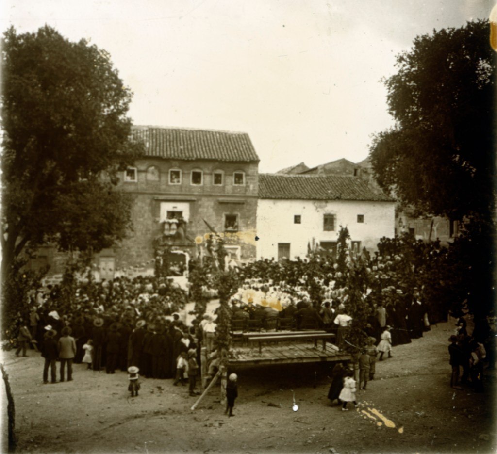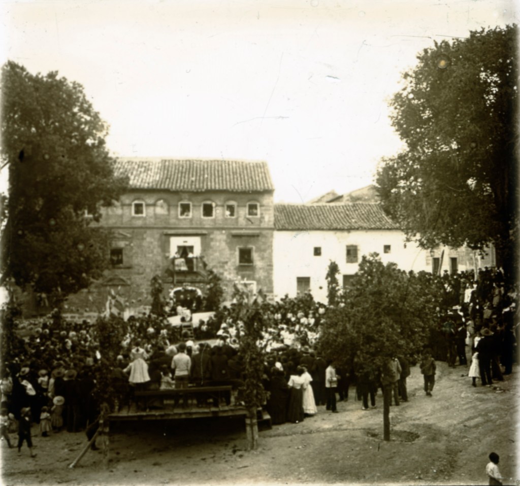 Otra referencia del siglo XIX la encontramos en el callejero de 1896, donde aparece situada la escuela municipal en los bajos del Ayuntamiento. Pero es en el mencionado trabajo que publiqué en 2010 donde cito un artículo del diario «El Liberal» que encontré en la hemeroteca de prensa histórica, que inmediatamente asocié a algunas fotografías de Cerdá y Rico que ilustran la noticia, en lo que supone un interesante testimonio del acto de reconocimiento a los alumnos celebrado en la plaza en junio de 1908[10].