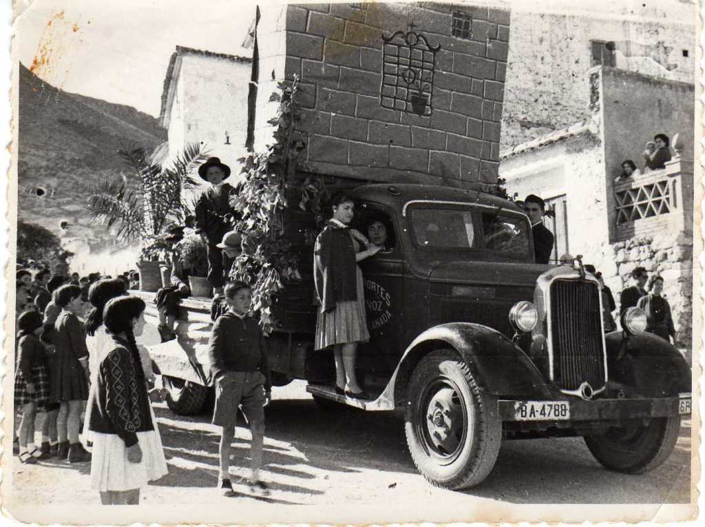 …esta foto pertenece a una cabalgata de carrozas y unos actos teatrales, realizados por el ingenio de Don Manuel Herrera y la colaboración de todos los maestros y padres de alumnos. Esta carroza (lástima que no se vea desde atrás) representaba el mesón de María Rienda. Detrás de lo que parece un muro había una gran chimenea con un santo cristo presidiendo y varios niños vestidos de la época. Había otra carroza que representaba el milagro de Fátima con La Virgen (que llevaba un rosario con unas bolas de cristal enormes, a duras penas lo podía aguantar la protagonista) y los pastorcillos, con corderos incluidos…