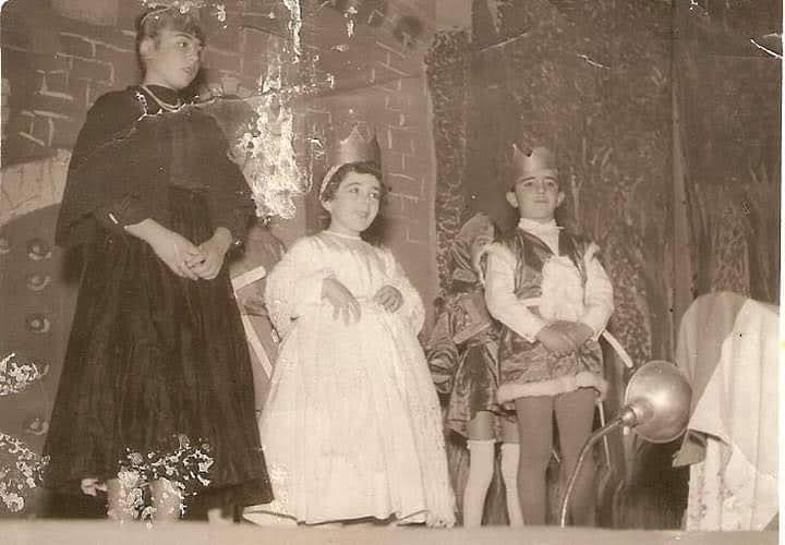 Según Paqui Moreno, coincidiendo con el día de San José de Calasanz (27 de noviembre) -patrono de los maestros-, Dª. Inés Molina preparaba obras de teatro que se representaban con gran éxito en el cine Benavente. Aparte de los niños que hacían de actores, colaboraban personas como Alfonso Caro, que hacía los decorados. Es el caso de esta de la imagen tomada en 1958 durante la representación de “El romance de Rosalinda”.