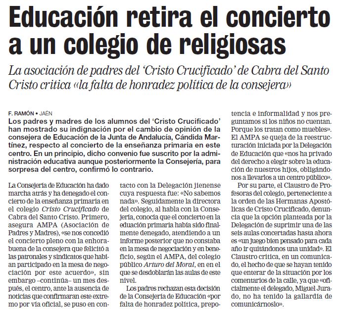 [19] DIARIO IDEAL. Educación retira el concierto a un colegio privado de Cabra. Número 22174 de 23 de abril de 2001. Portada.